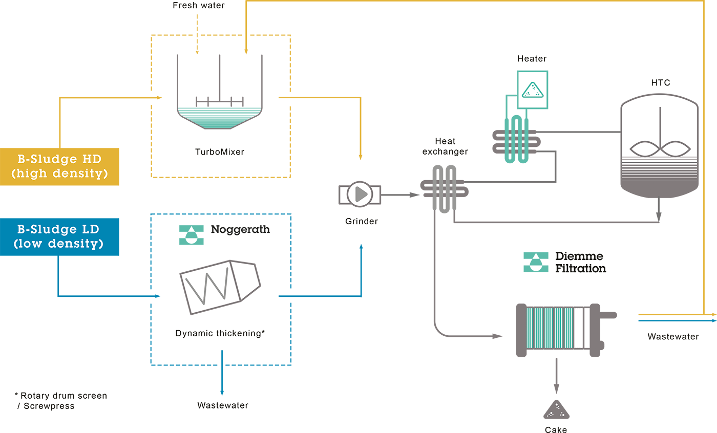 Il sistema B-Sludge (modulo fanghi) consente di trattare fanghi organici in ingresso diluiti, concentrati o disidratati, in un range operativo di Solidi Sospesi Totali dall’1% al 30% o più, equalizzandone la concentrazione mediante pre-trattamenti meccanici. Il fango pretrattato viene inviato al processo di carbonizzazione idrotermale (HTC) nelle condizioni fluidodinamiche ottimali e, successivamente, alla separazione solido-liquido mediante filtropressa, operante senza uso di polielettroliti.